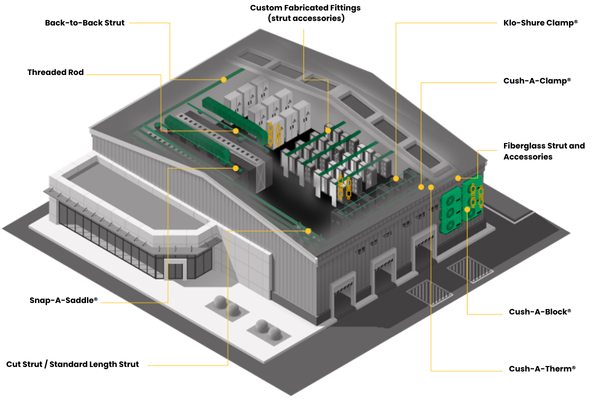 - Flexible configurations for cable trays, HVAC, piping, and cooling systems